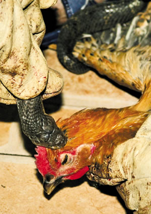 “表演馬上開始!”店里所有顧客都將眼光齊刷刷地盯著該男子的手。只見他左手將母雞死死按在地上,右手從鐵籠中隨手抓了一條長約1米的眼鏡蛇,用手卡住它的頸部!芭、啪、啪!”只見男廚師不停地拍打著蛇的頭部,試圖激怒它,但眼鏡蛇仍一動(dòng)不動(dòng)!霸趺床灰兀俊睅酌凶庸笮,一些食客也一撥接一撥地走了進(jìn)來。