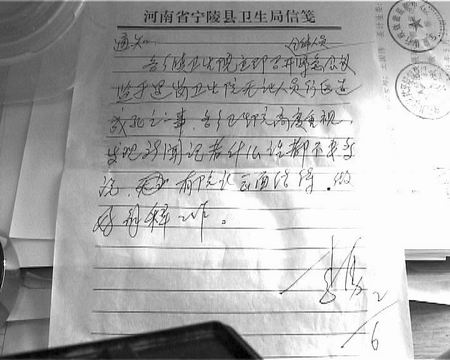 “寧陵縣邏崗鎮(zhèn)衛(wèi)生院沒(méi)有行醫(yī)資格的醫(yī)生給我兒媳接生,導(dǎo)致胎死腹中。”6月1日,商丘市民權(quán)縣伯黨鄉(xiāng)村民郭漢章打來(lái)熱線反映。而記者在采訪中,卻意外地發(fā)現(xiàn)一份該縣衛(wèi)生局長(zhǎng)簽名的通知,要求:“各鄉(xiāng)衛(wèi)生院高度重視,發(fā)現(xiàn)新聞?dòng)浾,什么話都不要多說(shuō)……”(如左圖)據(jù)郭漢章介紹,5月1日傍晚,兒媳趙婭君感到腹部陣痛,家人立即將其送入寧陵縣邏崗鎮(zhèn)衛(wèi)生院檢查!爱(dāng)晚做B超檢查時(shí),醫(yī)生說(shuō)胎音、羊水一切正常。第二天早上6點(diǎn),醫(yī)生王美英叫來(lái)一個(gè)人,一起將兒媳送進(jìn)產(chǎn)房后,兩個(gè)人不停地在兒媳腹部擠壓,一個(gè)半小時(shí)后,趙婭君全身顫抖,面色異常。做了檢查后,證實(shí)其腹中胎兒已經(jīng)死亡!