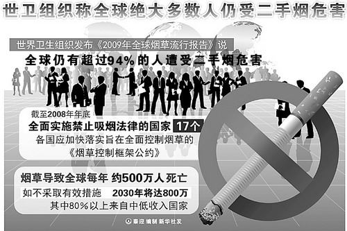 2008年10月30日,來(lái)自全國(guó)的400家環(huán)保民間組織的代表在北京發(fā)出共同聲音:吸煙是污染環(huán)境的行為,應(yīng)當(dāng)維護(hù)被動(dòng)吸煙者、維護(hù)環(huán)境的合法權(quán)益。他們呼吁盡快制定并頒布控?zé)熖貏e是公共場(chǎng)所禁煙的法律、法規(guī),并有效監(jiān)督實(shí)施。根據(jù)中華環(huán)保聯(lián)合會(huì)《被動(dòng)吸煙的調(diào)查問(wèn)卷報(bào)告》,85%的受調(diào)查公眾不清楚被動(dòng)吸煙對(duì)人體健康造成危害的嚴(yán)重性。而目前,我國(guó)的吸煙人數(shù)達(dá)到3.5億,被動(dòng)吸煙人數(shù)高達(dá)5.4億。我國(guó)于2003年11月10日簽署了世界衛(wèi)生組織的《煙草控制框架公約》,2006年1月9日,該《公約》在我國(guó)生效。