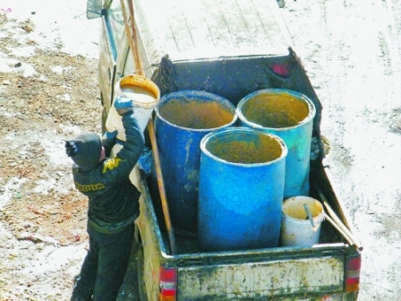 薩爾圖區(qū)三建沙石料場附近,有兩處黑加工點(diǎn)。其中一家大門緊閉,院內(nèi)有淘油車和煉油的鍋具。另一家黑加工點(diǎn)設(shè)在水泡邊,有兩輛淘油車,幾十只鐵桶,兩只煉油的大鍋,幾桶已經(jīng)煉制好的油脂就擺在門口。據(jù)了解,這是一個數(shù)家合用的黑加工點(diǎn)。