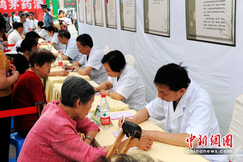 記者在現場看到,文化節(jié)分設了義診區(qū)、文藝表演區(qū)、展覽區(qū)和咨詢區(qū),除了傳統(tǒng)中藥材、保健品展示外,還將在活動期間現場免費發(fā)放萬袋解暑良藥。整個活動中尤以中醫(yī)專家現場義診區(qū)最為“火爆”, 不少聞訊而至的市民一大早即在展位前列隊等候,到了中午,各展位前等待問診者仍是絡繹不絕。其中不僅有注重養(yǎng)生健體的中老年人,亦吸引了不少為健康減肥、樂于食療的年輕人駐足。而在活動現場的大型圖片展板上,還詳細列舉各類食療養(yǎng)生的配方與原理,配合四季介紹了強身、美容的養(yǎng)生茶,吸引了各個年齡段的人士觀看、解讀與摘抄。