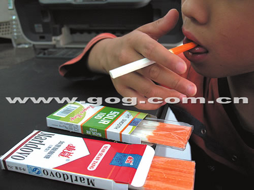 記者看見,劉女士從兒子那里收繳的某品牌的酸酸糖是廣東一家食品廠生產(chǎn)的,從外包裝看,它就像一包香煙,每盒5支裝,每一支酸酸糖乍一看與一支香煙沒有區(qū)別,過濾嘴是用黃色色素染出來的。