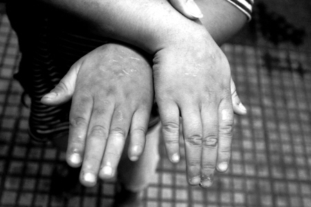 雖然院子里的孩子很多,但一眼就能認(rèn)出玲玲,身材瘦小,臉上、耳后都是傷疤,雙眼腫脹,撩開(kāi)右臂衣袖,可以發(fā)現(xiàn)3塊醒目的大傷疤。玲玲遲疑了一下說(shuō):“是爸爸用燒熱的打火機(jī)燙的!