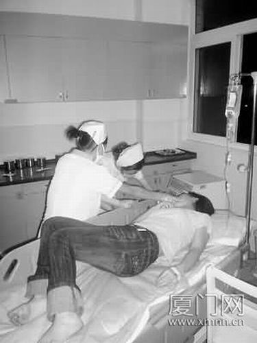 記者趕到醫(yī)院時(shí),醫(yī)護(hù)人員正為3名女子洗胃。她們的頭邊,布滿了吐出的穢物,一名穿黑色衣服的男子在旁邊急得團(tuán)團(tuán)轉(zhuǎn)!八齻兌际俏业挠H人,其中一人是我老婆,具體是怎樣中毒的我也不清楚,接到電話剛趕過來!彼f,“晚上親戚從湖里寨上趕過來串門,在家里做的晚飯,吃過不久,一個(gè)親戚就嘔吐。隨后大家都吐了,手腳發(fā)黑、嘴唇發(fā)干。晚飯的菜是兩個(gè)女孩在外面買的,有青菜、也有蝦、肉丸等。”