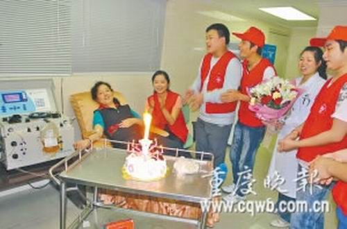 昨日(11月3日),解放軍重慶血站暨西南醫(yī)院輸血科。宮渝蓉以今年第9次無償獻血,來慶祝自己的49歲生日。至此,她的全年獻血量累計達5400毫升成分血(主要含量為血小板和水)。解放軍重慶血站證實,近10年來,她獻出近13000毫升血。