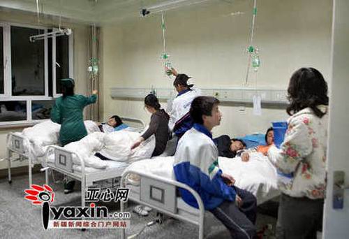 當(dāng)天22時(shí)30分左右,記者趕到救治學(xué)生最多的昌吉市人民醫(yī)院時(shí),只見一樓的兩個(gè)病房里,每張病床上都躺著一名或是兩名學(xué)生,他們都在輸著液體。而在另外一個(gè)輸液室里,至少坐著二十名身著校服的學(xué)生,他們都在輸著液,但從他們的表情看,癥狀應(yīng)該較輕。在這些病房的門口,記者發(fā)現(xiàn),每個(gè)病房的門口都有一名成年人在把守著,當(dāng)記者試圖想進(jìn)入病房時(shí),就被這名成年人攔住不讓進(jìn)。并稱他們是學(xué)生的老師,所以采訪他們均不接受。