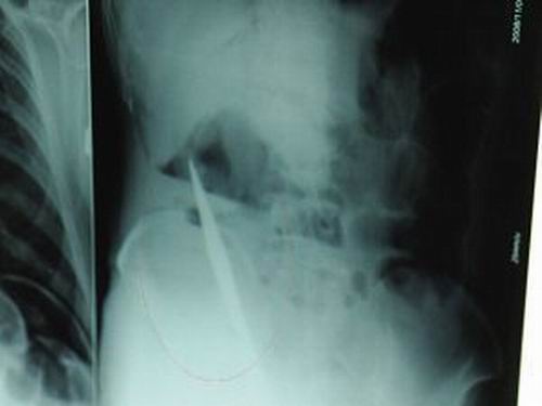 昨天(11月6日)上午,記者在徐州礦務集團總醫(yī)院重癥監(jiān)護室見到了這名男子,目前他雖然已經恢復了意識,但還不能開口說話,需要呼吸機輔助呼吸。據醫(yī)生介紹,4日中午12時左右,這名男子因服毒輕生被緊急送到醫(yī)院進行搶救,之前,這名男子已經在當地鄉(xiāng)鎮(zhèn)醫(yī)院進行了近20小時的治療,但效果不佳!安∪吮晦D院到礦總院時已神志不清,血壓極低,處于休克狀態(tài)。”救護人員給男子洗胃、初步處理以后,發(fā)現(xiàn)男子呼吸急促,于是趕緊給他拍片檢查。結果讓所有的醫(yī)生大吃一驚,竟有一把尖狀異物橫在該男子腹腔內!當天下午5時30分,輕生男子被推上了手術臺。經過40多分鐘的手術,該男子腹腔被打開,手術醫(yī)生發(fā)現(xiàn),男子體內的金屬狀異物竟然是一把長19厘米的尖刀!