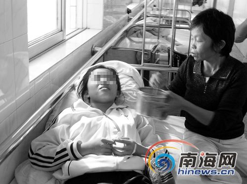 11月17日下午,記者在海南省農(nóng)墾總局醫(yī)院神經(jīng)內(nèi)科病房看到,阿霞的媽媽、姨媽和同學(xué)都在一旁照顧阿霞。阿霞目光呆滯,嘴里不時(shí)地喃喃自語(yǔ)說(shuō):“我好奇心強(qiáng),我要找知音陪我去逛街,我有好多話要說(shuō),我想找回我的記憶……”阿霞的媽媽和同學(xué)告訴記者,阿霞讀書很刻苦,成績(jī)都排在前幾位,她一直向往重點(diǎn)高中,還夢(mèng)想著考上重點(diǎn)大學(xué),考試總想要考第一。