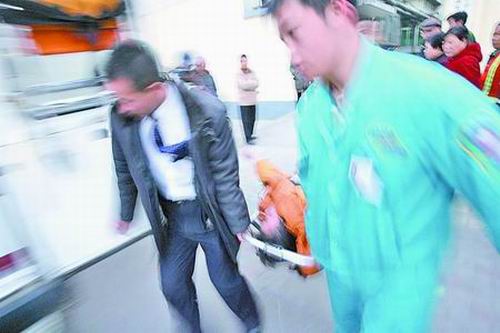嘔吐的張某被抬上急救車(chē) 李文波 圖