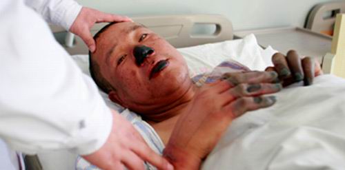 昨日(1月14日),記者在省武警醫(yī)院見到尹某,心頭不禁一震。尹某面部被嚴(yán)重凍傷,均已腫脹,鼻子和下唇均壞死,變成黑色,手和腳用紗布包著,看到黑色的指頭。