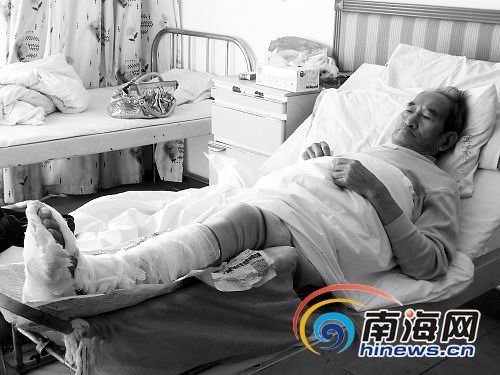 3日下午,記者在海南邊防醫(yī)院見到了受傷的張老漢。老人躺在病床上,左腳纏了繃帶并用木板固定住。張老漢回憶說,1日下午4點(diǎn)左右,他在博愛南路過馬路,打算去附近的東湖站臺(tái)乘坐剛到站的36路公交車。這時(shí),一輛開往博愛南路方向的摩托車緊貼著他的身子急速行駛過來。摩托車后輪的輻條將他的左腳“拐”進(jìn)車輪內(nèi),他覺得一陣鉆心的疼痛。“之后,我被拖行了2米多,摩托車才停了下來,我趁機(jī)將腳抽出來,司機(jī)卻開著車跑了”。張老漢氣憤地說。