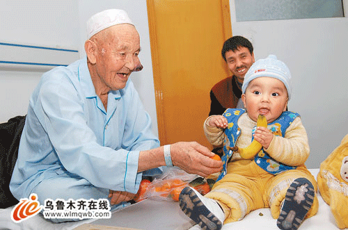 老人說,自己是阿克蘇烏什縣的農(nóng)民,身份證上顯示95歲,實(shí)際上自己今年已經(jīng)103歲了。他共有12個(gè)子女,其中有9個(gè)已經(jīng)辭世,最小的兒子今年36歲,現(xiàn)在共有11個(gè)孫子孫女,最小的孫子目前不滿1歲。