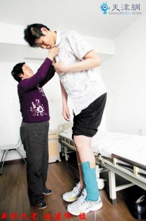 趙亮走起路來動作很慢,甚至是一瘸一拐的,他的左腳幾乎用不上力。他摸著左腳說,自從在一次扣籃中扭傷了左腳后走路就總是“踮腳”,時間一久,就慢慢變成了一瘸一拐。隨著年齡的增長,趙亮的傷情也越來越重。上周五,在親戚的介紹下,他來到天津檢查身體。