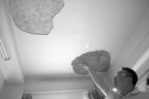 5日14時許,記者來到道里區(qū)達江小區(qū)3號樓一層門市房。此時,侯女士在女兒和女婿的照看下躺在床上休息!霸滥甘窃诤⒆优P室被砸傷的。”說著,侯女士的女婿倪先生帶記者來到現(xiàn)場。近30平方米的臥室棚頂有一塊約1平方米的面積裸露出水泥。與其相距半米的地方,有一塊天棚已用水泥抹平。脫落的墻皮碎得滿地都是,墻皮厚度約1.5厘米。