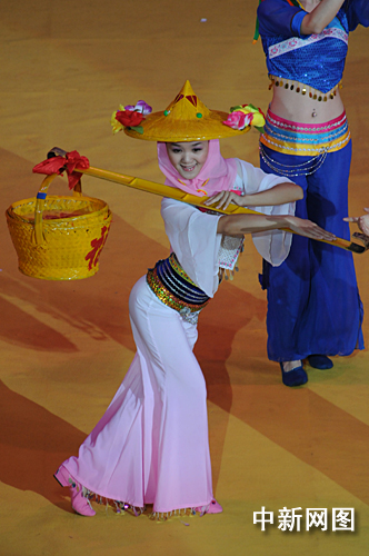 圖為福建“惠安女”挑著竹籃表演趕送節(jié),以舞蹈表達心中的喜悅之情。