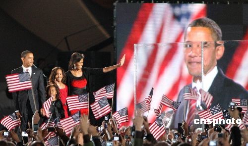 圖為奧巴馬與妻兒在芝加哥慶祝晚會現(xiàn)場。