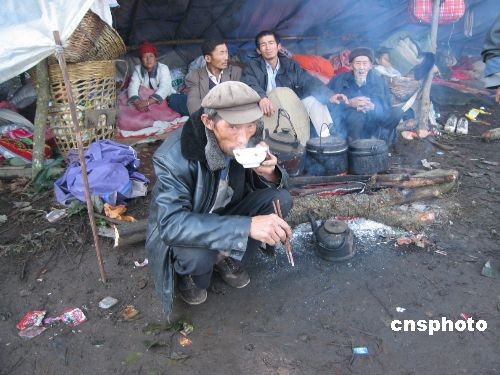 圖為十一月六日,被緊急安置的村民們在救災(zāi)帳篷前吃早飯。中新社發(fā) 保旭 攝