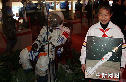 少先隊員與“神七”航天員翟志剛所穿航天服合影。孫自法 攝