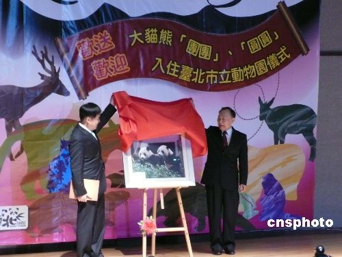 圖為歡送“團(tuán)團(tuán)”“圓圓”赴臺(tái)代表團(tuán)團(tuán)長趙學(xué)敏和臺(tái)北市長郝龍斌共同為“團(tuán)團(tuán)”“圓圓”基因檔案大幅照片揭幕。