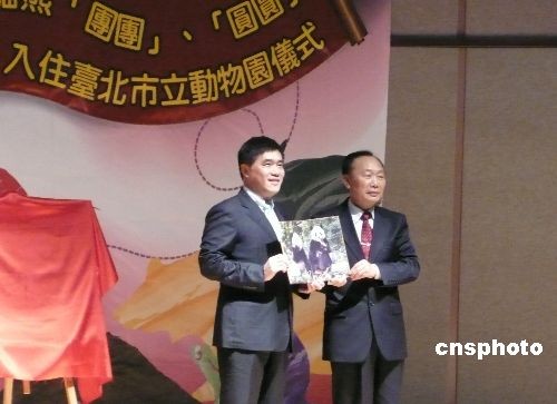 圖為歡送“團(tuán)團(tuán)”“圓圓”赴臺(tái)代表團(tuán)團(tuán)長趙學(xué)敏向臺(tái)北市長郝龍斌贈(zèng)送“團(tuán)團(tuán)”“圓圓”基因檔案,象征交接正式完成。