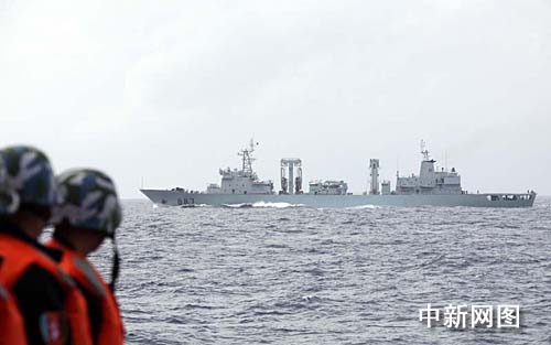 圖為“?凇碧枌(dǎo)彈驅(qū)逐艦隨艦特戰(zhàn)隊(duì)員在航行途中遠(yuǎn)眺“微山湖”號綜合補(bǔ)給艦。 中新社記者 孫自法 攝