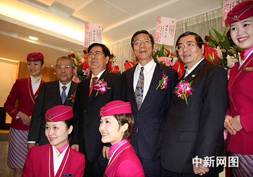 1月15日,大陸南方航空公司在臺(tái)北正式成立辦事處,成為首家在臺(tái)灣掛牌運(yùn)營(yíng)的大陸企業(yè)。圖為開業(yè)揭幕儀式典禮上南航空姐與參加儀式的臺(tái)灣和大陸嘉賓合影。中新社記者 陳立宇 攝