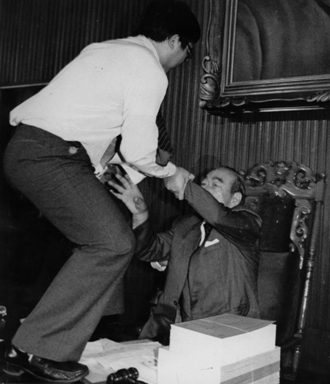 待劉闊才又握住一支麥克風(fēng),準(zhǔn)備作裁定時,朱高正在高喊“我要求辯論”后雙手一撐,翻上主席臺,以雙手扭扯主席劉闊才,劉闊才在座位上搖搖晃晃,險象環(huán)生。