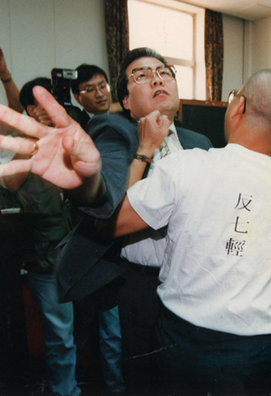 當(dāng)朱高正跳上主席臺,議場內(nèi)頓時像爆發(fā)的活火山,趙少康等人沖上發(fā)言臺,抓住高站在主席臺上的朱高正的腳踝。后排的“立委”則大喊“上!”“打死他,打死他!”,個個爭先恐后沖向主席臺。