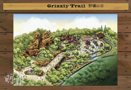 主題園區(qū)的故事設定于偏遠淘金小鎮(zhèn),但大灰熊卻因淘金被觸怒。一班尋金者乘“大野礦山飛車”橫越整個小鎮(zhèn),但飛車在崎嶇斜坡上突然急速倒駛,一群實物原大的發(fā)聲機動大灰熊也會施襲搞破壞,弄得乘客東歪西倒,最后更會觸動炸藥裝置,令飛車從山中高速“噴射”出來!按笠暗V山飛車”相信是這次擴建中,刺激度最高的一個設施。