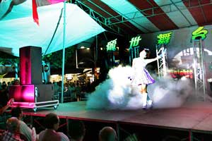 七月歌臺的燈光璀璨奪目,一身閃耀裝扮的歌手落力地勁歌熱舞,臺下觀眾有些閑坐在椅子上觀賞,更多是站在一旁湊熱鬧聽歌的。只見有個身影穿梭在喧鬧的人群中,手持著半專業(yè)型相機(jī)正在專心攝影,為歷史留下紀(jì)錄。