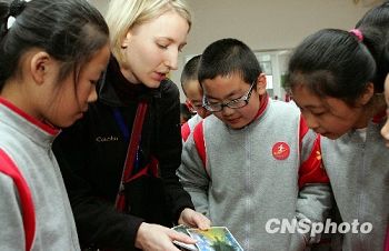 12月7日,2009年“漢語橋——美國中小學(xué)校長訪華之旅”代表團(tuán)首次來閩交流訪問。70名代表中,33名代表來福州參觀訪問,37名赴廈門參觀訪問。圖為美國科羅拉多學(xué)院代表正與福州實驗小學(xué)學(xué)生交流,介紹美國風(fēng)景。據(jù)了解,近年來,美國開設(shè)漢語課程的中小學(xué)大幅增加,已由2005年的263所增至2009年779所。漢語已經(jīng)成為美國外語教學(xué)中發(fā)展最快的語種。(中新社/張麗君 攝)