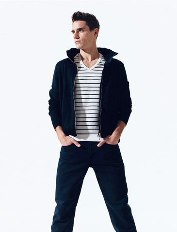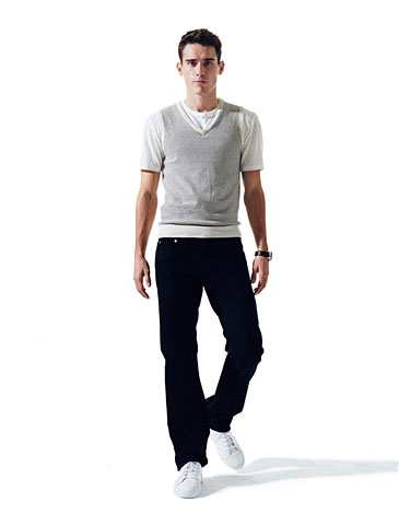 二:做舊的黑色?肯定!Marky Ramone 可能更喜歡他的黑色牛仔褲,但時,如果你穿著一件運(yùn)動背心外套,或者休閑毛衣的話,仔褲最好也要具有同樣的優(yōu)雅質(zhì)地才可以。我們建議你選擇一跳炭灰黑色的略有褪色的仿舊效果仔褲,然后白色T恤,加上運(yùn)動鞋,就可以了。