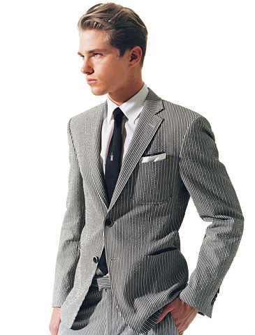 七:條紋外套?肯定!再發(fā)愁你的條紋西裝沒法穿么?的確,如今大概只有四歲的孩子和沒有時尚品味的人才會選擇那種淺色的泡泡紗外套來作為自己的“出場”服裝。但是,告訴你個方法,只要簡單的加上黑色和白色的話,這款搭配就變得相當(dāng)?shù)挠行、成熟了。搭配白色的襯衫,黑色的領(lǐng)帶,和一塊口袋方巾,那么無論是日常的辦公或者是小型的PARTY聚會,就都很合適了!!