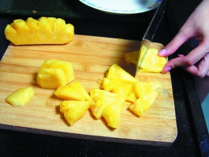 1 菠蘿去皮和眼洗凈,果肉切成塊狀;紅蘿卜、紅椒切成丁;青豆放入沸水中焯一下,撈起過冷河。