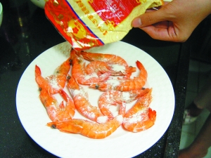 2 對蝦剪去尖刺和蝦須洗凈,用廚房紙吸干水分,灑上1/2杯萬用香炸粉,讓蝦身均勻地裹上一層香炸粉。