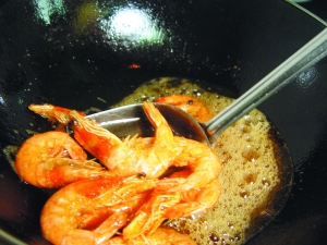 3 燒熱1碗油,放入對蝦開大火炸2分鐘,撈起用廚房紙吸干余油。