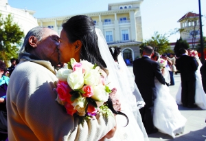 “你愿意做我妻子嗎?”81歲的吳介琴單膝跪地向愛人蔣曉輝求婚時,在場親朋給予3分鐘的掌聲。昨日,與另十對網(wǎng)戀成功的情侶一起,81歲的吳介琴與小自己23歲的蔣曉輝走進(jìn)結(jié)婚殿堂;楹笏麄儗⒃谒拇ㄉ睢