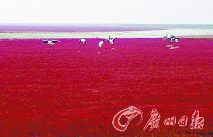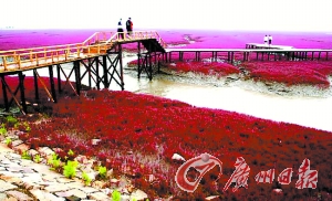 在美麗、富饒的遼河三角洲的海岸灘涂上,延綿百里、大片地生長(zhǎng)著一種生命力頑強(qiáng)的潮間帶植物堿蓬草。堿蓬草每年四五月間長(zhǎng)出地面,初為綠色,由于受海水的浸泡,太陽(yáng)光照射下漸由綠變紅,9月至11月,呈紫紅色。秋風(fēng)吹拂下,紫紅色的堿蓬草涌起重重的波浪,“紅海灘”因此得名。