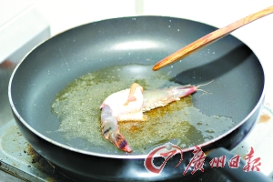 3. 放較多的油,油熱后把撈過(guò)香炸生粉的“翅蝦”放在鍋中炸至黃金色,時(shí)間約10分鐘。