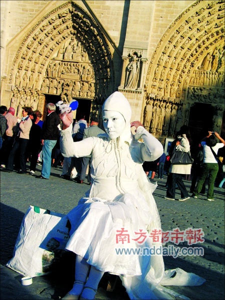 這個(gè)美女把自己渾身抹得雪白,扮成雕塑。