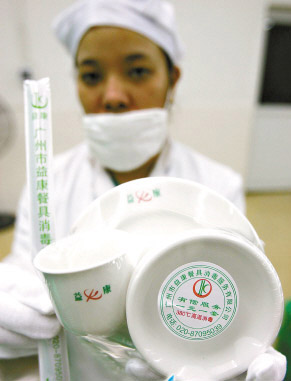 當(dāng)你去餐館用餐時(shí),是否被加收過(guò)1元的“放心碗”餐具費(fèi)?對(duì)于這套被塑料膠膜包裹的消毒餐具,你是否能夠不用茶水清洗而放心使用呢?由于目前缺少對(duì)餐具集中消毒企業(yè)的進(jìn)行監(jiān)管的法律法規(guī),消費(fèi)者對(duì)集中消毒碗筷缺乏信心,因此,廣州市人大代表建議暫不推行集中消毒碗筷。