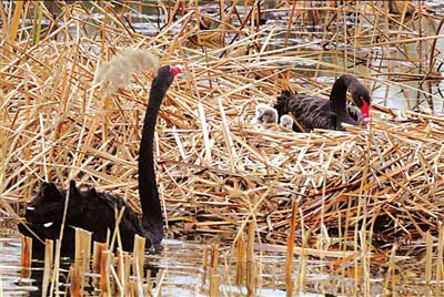 黑天鵝寶寶破殼出世,雄天鵝一直在窩旁巡視。 本報(bào)記者張斌攝