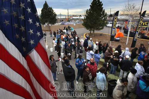 2008年11月25日,美國科羅拉多州丹佛市,人們在寒風(fēng)中排隊等待領(lǐng)取感恩節(jié)的免費火雞和其他食物。丹佛市的慈善機構(gòu)計劃在感恩節(jié)之前向大約1200戶有需要的困難家庭發(fā)放感恩節(jié)食物。