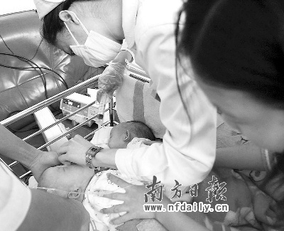 今年9月5日,化州市笪橋鎮(zhèn)一婦女產(chǎn)下一對(duì)連體女?huà)搿?月8日,連體女?huà)氡凰偷缴钲谑袃和t(yī)院檢查治療。經(jīng)醫(yī)院檢查發(fā)現(xiàn),連體姐妹各自擁有一個(gè)肝臟,只是兩個(gè)肝臟連在一起,分離手術(shù)的成功率很大。院方?jīng)Q定前日上午9時(shí)進(jìn)行手術(shù)。