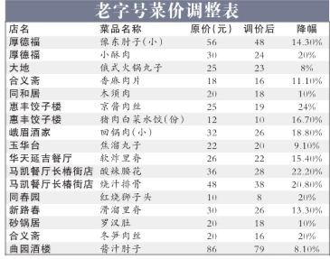 他還表示,由于各老字號在前期原材料價格上漲時,上調(diào)價格的幅度各不相同,因此本次菜品價格下調(diào)幅度也有不同。
