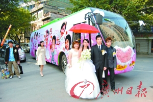 上周六,一輛裝飾十分浪漫溫馨的“幸福巴士”載著一對新人穿行在同福路、吉祥路、惠福路等廣州市區(qū)里寓意吉祥的街道,這種少見的迎親方式引來不少市民駐足觀看。