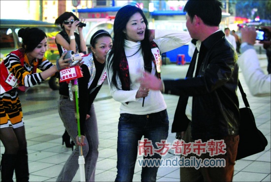 由于她們身材高挑、長相標致、穿著性感,很快便吸引了大量圍觀者。起初現(xiàn)場沒有人愿意接受這些行為怪異的女“記者”采訪,采訪受阻后,美女們將目標重新定位,瞄準了過往行人中的帥哥。效果還不錯,其中幾名帥哥抵擋不住“辣妹”的誘惑,非常豪爽地接受了采訪。