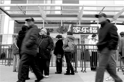 昨天,市民趕到家樂(lè)福時(shí)吃了閉門(mén)羹。王苡萱攝