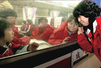 昨天下午,60多名震后在北京上學的青川小學生,坐大巴一路唱著歌來到車站,一提起回家就興奮不已。孩子們身著統(tǒng)一的服裝、手拎著大包。下午4點40分,火車即將出站,同學們原本興奮的臉上掛著淚珠,靠近站臺的車窗前擠滿了小腦袋,他們不斷拍打窗戶和老師告別。