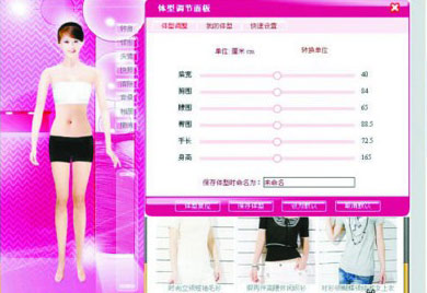 “網(wǎng)上試衣間”類似于網(wǎng)絡(luò)上曾經(jīng)流行的 “美女換裝游戲”,只是由專業(yè)公司開發(fā)的 “網(wǎng)上試衣間”,它可以根據(jù)網(wǎng)民自己上傳照片、填寫三圍,而設(shè)計(jì)出一個(gè)虛擬的“我”,在試衣間里試各種各樣的衣服。在一個(gè)試衣網(wǎng),網(wǎng)友可以點(diǎn)擊相關(guān)設(shè)置中的模特、頭像、體型、背景等,更換自己喜歡的模特、頭像和不同顏色、風(fēng)格各異的試衣背景,體型選項(xiàng)中為顧客提供了三圍、肩寬、身高、臂長等參數(shù),顧客可以調(diào)整這些數(shù)據(jù)使模特的體型接近自己,制造完自己的模特后便可以在服裝欄中鏈接的網(wǎng)店去隨意挑選自己滿意的服裝了。